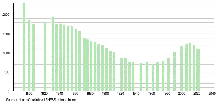 L'évolution du nombre d'habitants est connue à travers les recensements de la population effectués dans la commune depuis 1793. Pour les communes de moins de 10 000 habitants, une enquête de recensement portant sur toute la population est réalisée tous les cinq ans, les populations légales des années intermédiaires étant quant à elles estimées par interpolation ou extrapolation[30]. Pour la commune, le premier recensement exhaustif entrant dans le cadre du nouveau dispositif a été réalisé en 2005[31].