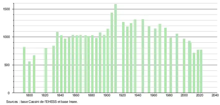 L'évolution du nombre d'habitants est connue à travers les recensements de la population effectués dans la commune depuis 1793. Pour les communes de moins de 10 000 habitants, une enquête de recensement portant sur toute la population est réalisée tous les cinq ans, les populations légales des années intermédiaires étant quant à elles estimées par interpolation ou extrapolation[24]. Pour la commune, le premier recensement exhaustif entrant dans le cadre du nouveau dispositif a été réalisé en 2007[25].