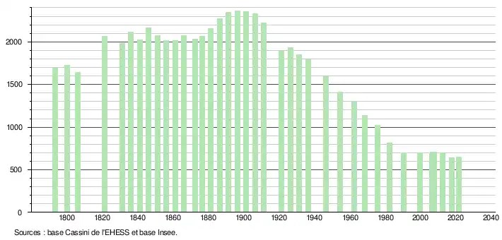 L'évolution du nombre d'habitants est connue à travers les recensements de la population effectués dans la commune depuis 1793. Pour les communes de moins de 10 000 habitants, une enquête de recensement portant sur toute la population est réalisée tous les cinq ans, les populations légales des années intermédiaires étant quant à elles estimées par interpolation ou extrapolation[24]. Pour la commune, le premier recensement exhaustif entrant dans le cadre du nouveau dispositif a été réalisé en 2007[25].