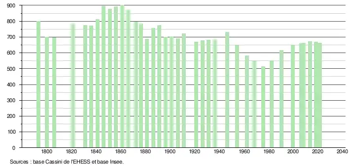 L'évolution du nombre d'habitants est connue à travers les recensements de la population effectués dans la commune depuis 1793. Pour les communes de moins de 10 000 habitants, une enquête de recensement portant sur toute la population est réalisée tous les cinq ans, les populations légales des années intermédiaires étant quant à elles estimées par interpolation ou extrapolation[50]. Pour la commune, le premier recensement exhaustif entrant dans le cadre du nouveau dispositif a été réalisé en 2008[51].
