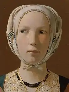 À droite du jeune homme, derrière lui, se trouve une troisième jeune femme, représentée de face, « aussi pâle et mystérieuse que la lune[8] ». L'éclairage sur la partie gauche de son visage révèle en effet un teint laiteux de porcelaine contrastant avec celui, plus mat, des autres gitanes. Elle a les cheveux entièrement recouverts par un fichu blanc à rayures bleues noué en dessous du menton, qui enserre son visage dans un ovale parfait[9]. Une esquisse de sourire ambigu aux lèvres, les yeux en coin — ce qui rappelle une Jardinière gravée par le maniériste lorrain Jacques Bellange[10] —, elle regarde subrepticement vers la gauche de la toile, pour surveiller les réactions du jeune homme, ou pour répondre au regard complice de l'autre jeune fille du second plan.