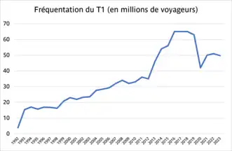 La ligne T1 dessert depuis cette date vingt-six stations et transporte en moyenne 100 000 voyageurs chaque jour ouvrable en 2003[a 6], fréquentation qui atteint en semaine 115 000 voyageurs par jour en 2008[8].