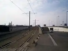 Dans les zones moins sensibles aux vibrations, on insère plus simplement sur le lit de béton des plaques, préfabriquées en usine, entre les deux files de rails d'une des voies, afin d'achever la plate-forme et son aspect pavé traditionnel. Cette pose est très différente de celle initiale de la ligne, où des pavés de granit avaient été posés de manière traditionnelle lors de l'achèvement de la plate-forme, mais n'avaient pas résisté à l'orniérage de la voie[13].