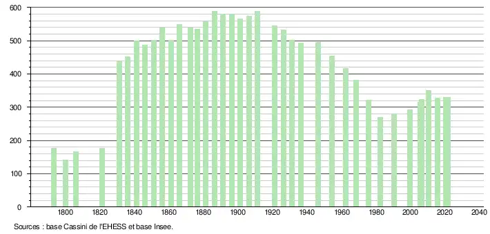 L'évolution du nombre d'habitants est connue à travers les recensements de la population effectués dans la commune depuis 1793. Pour les communes de moins de 10 000 habitants, une enquête de recensement portant sur toute la population est réalisée tous les cinq ans, les populations légales des années intermédiaires étant quant à elles estimées par interpolation ou extrapolation[22]. Pour la commune, le premier recensement exhaustif entrant dans le cadre du nouveau dispositif a été réalisé en 2005[23].