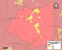Les mouvements de terrains susceptibles de se produire sur la commune sont des tassements différentiels[16]. Le retrait-gonflement des sols argileux est susceptible d'engendrer des dommages importants aux bâtiments en cas d’alternance de périodes de sécheresse et de pluie[17]. La totalité de la commune est en aléa moyen ou fort (79,5 % au niveau départemental et 48,5 % au niveau national)[Carte 2]. Depuis le , en application de la loi ÉLAN, différentes contraintes s'imposent aux vendeurs, maîtres d'ouvrages ou constructeurs de biens situés dans une zone classée en aléa moyen ou fort[Note 6],[18].
