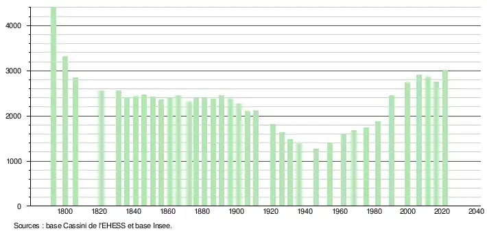 L'évolution du nombre d'habitants est connue à travers les recensements de la population effectués dans la commune depuis 1793. Pour les communes de moins de 10 000 habitants, une enquête de recensement portant sur toute la population est réalisée tous les cinq ans, les populations légales des années intermédiaires étant quant à elles estimées par interpolation ou extrapolation[28]. Pour la commune, le premier recensement exhaustif entrant dans le cadre du nouveau dispositif a été réalisé en 2006[29].