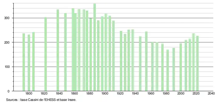 L'évolution du nombre d'habitants est connue à travers les recensements de la population effectués dans la commune depuis 1793. Pour les communes de moins de 10 000 habitants, une enquête de recensement portant sur toute la population est réalisée tous les cinq ans, les populations légales des années intermédiaires étant quant à elles estimées par interpolation ou extrapolation[16]. Pour la commune, le premier recensement exhaustif entrant dans le cadre du nouveau dispositif a été réalisé en 2006[17].
