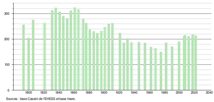 L'évolution du nombre d'habitants est connue à travers les recensements de la population effectués dans la commune depuis 1793. Pour les communes de moins de 10 000 habitants, une enquête de recensement portant sur toute la population est réalisée tous les cinq ans, les populations légales des années intermédiaires étant quant à elles estimées par interpolation ou extrapolation[15]. Pour la commune, le premier recensement exhaustif entrant dans le cadre du nouveau dispositif a été réalisé en 2007[16].