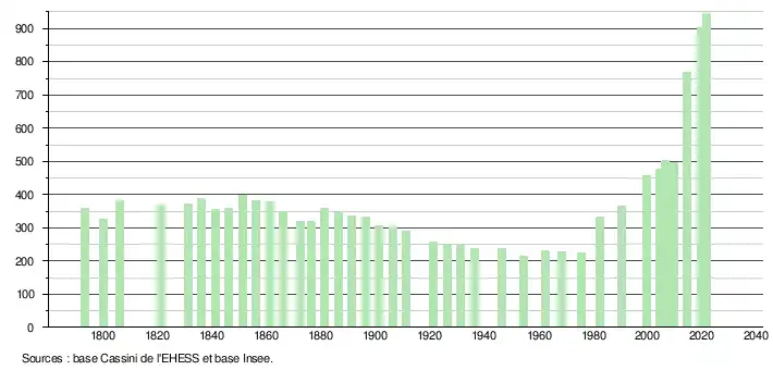 L'évolution du nombre d'habitants est connue à travers les recensements de la population effectués dans la commune depuis 1793. Pour les communes de moins de 10 000 habitants, une enquête de recensement portant sur toute la population est réalisée tous les cinq ans, les populations légales des années intermédiaires étant quant à elles estimées par interpolation ou extrapolation[20]. Pour la commune, le premier recensement exhaustif entrant dans le cadre du nouveau dispositif a été réalisé en 2004[21].