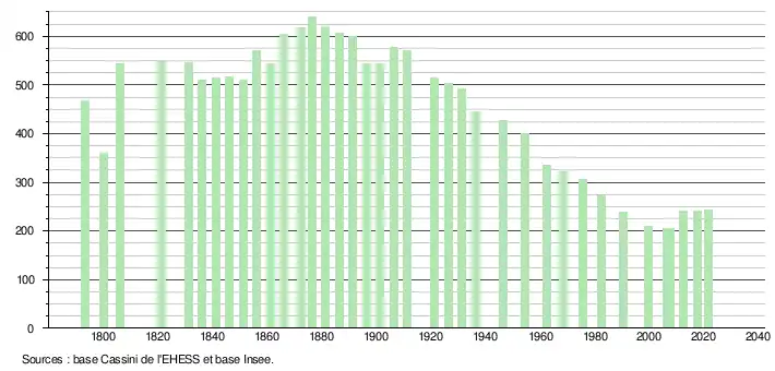 L'évolution du nombre d'habitants est connue à travers les recensements de la population effectués dans la commune depuis 1793. Pour les communes de moins de 10 000 habitants, une enquête de recensement portant sur toute la population est réalisée tous les cinq ans, les populations légales des années intermédiaires étant quant à elles estimées par interpolation ou extrapolation[19]. Pour la commune, le premier recensement exhaustif entrant dans le cadre du nouveau dispositif a été réalisé en 2007[20].