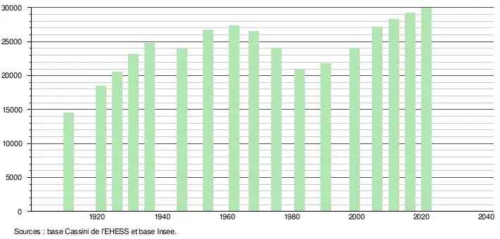 - Par convention dans Wikipédia, le principe a été retenu de n’afficher dans le tableau des recensements et le graphique, pour les populations légales postérieures à 1999, que les populations correspondant à une enquête exhaustive de recensement pour les communes de moins de 10 000 habitants, et que les populations des années 2006, 2011, 2016, etc. pour les communes de plus de 10 000 habitants, ainsi que la dernière population légale publiée par l’Insee pour l'ensemble des communes.