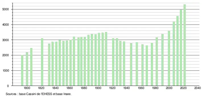 L'évolution du nombre d'habitants est connue à travers les recensements de la population effectués dans la commune depuis 1793. Pour les communes de moins de 10 000 habitants, une enquête de recensement portant sur toute la population est réalisée tous les cinq ans, les populations légales des années intermédiaires étant quant à elles estimées par interpolation ou extrapolation[26]. Pour la commune, le premier recensement exhaustif entrant dans le cadre du nouveau dispositif a été réalisé en 2006[27].
