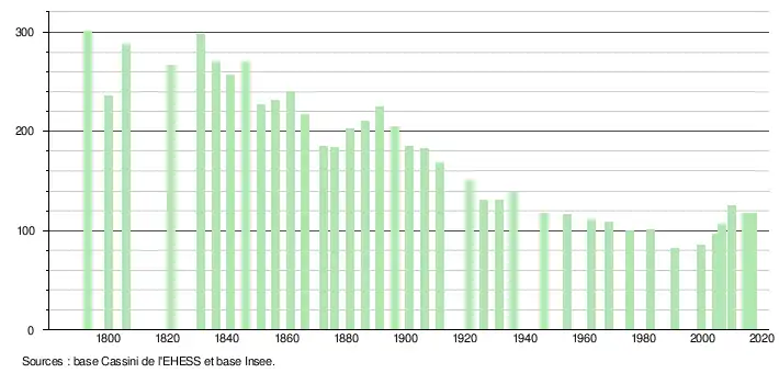 L'évolution du nombre d'habitants est connue à travers les recensements de la population effectués dans la commune depuis 1793. Pour les communes de moins de 10 000 habitants, une enquête de recensement portant sur toute la population est réalisée tous les cinq ans, les populations légales des années intermédiaires étant quant à elles estimées par interpolation ou extrapolation[13]. Pour la commune, le premier recensement exhaustif entrant dans le cadre du nouveau dispositif a été réalisé en 2004[14].