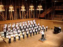 La scène, d'une superficie de 260 m2, est entourée par une haie de bouleaux séchés. Pour obtenir une grande qualité acoustique, les concepteurs du projet ont travaillé en étroite collaboration avec l'acousticien Albert Yaying Xu. Au plafond, une gigantesque feuille d'aluminium assure la bonne diffusion du son, en effet la disposition et la mise en œuvre de cet abat-son évite ainsi tout phénomène d'écho. L'éclairage se fait par six lustres en cristal de Murano et de Bohème. Et en souvenir des forêts de la lointaine Russie 120 bouleaux coupés entourent la scène.