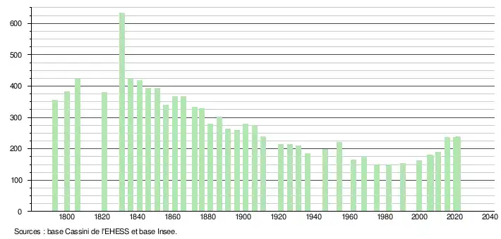 L'évolution du nombre d'habitants est connue à travers les recensements de la population effectués dans la commune depuis 1793. Pour les communes de moins de 10 000 habitants, une enquête de recensement portant sur toute la population est réalisée tous les cinq ans, les populations légales des années intermédiaires étant quant à elles estimées par interpolation ou extrapolation[30]. Pour la commune, le premier recensement exhaustif entrant dans le cadre du nouveau dispositif a été réalisé en 2005[31].