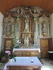 - Église Notre-Dame des XIe, XIVe – XVIIIe siècles, d'origine romane, avec un appareil en arête-de-poisson[Note 5]. L'édifice abrite un maître-autel daté de 1770, retable et statues saint Sébastien, saint Michel et Vierge à l'Enfant, de style baroque classé, en 1957, au titre objet aux monuments historiques[30] ainsi qu'un bas-relief du XVIe.