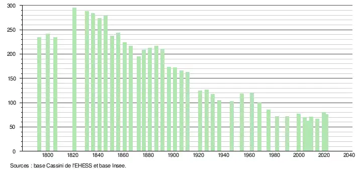 L'évolution du nombre d'habitants est connue à travers les recensements de la population effectués dans la commune depuis 1793. Pour les communes de moins de 10 000 habitants, une enquête de recensement portant sur toute la population est réalisée tous les cinq ans, les populations légales des années intermédiaires étant quant à elles estimées par interpolation ou extrapolation[15]. Pour la commune, le premier recensement exhaustif entrant dans le cadre du nouveau dispositif a été réalisé en 2004[16].
