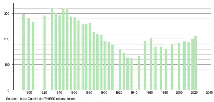 L'évolution du nombre d'habitants est connue à travers les recensements de la population effectués dans la commune depuis 1793. Pour les communes de moins de 10 000 habitants, une enquête de recensement portant sur toute la population est réalisée tous les cinq ans, les populations légales des années intermédiaires étant quant à elles estimées par interpolation ou extrapolation[27]. Pour la commune, le premier recensement exhaustif entrant dans le cadre du nouveau dispositif a été réalisé en 2007[28].
