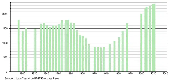 L'évolution du nombre d'habitants est connue à travers les recensements de la population effectués dans la commune depuis 1793. Pour les communes de moins de 10 000 habitants, une enquête de recensement portant sur toute la population est réalisée tous les cinq ans, les populations légales des années intermédiaires étant quant à elles estimées par interpolation ou extrapolation[25]. Pour la commune, le premier recensement exhaustif entrant dans le cadre du nouveau dispositif a été réalisé en 2008[26].