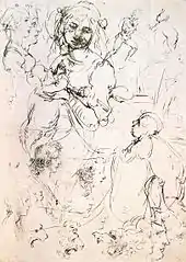 Le motif de la Vierge du lait se trouve dans des esquisses de la main de Léonard de Vinci[5], notamment sur un dessin conservé dans les collections royales du château de Windsor. Ce thème, très courant avant et pendant la Renaissance, n'est donc pas le propre de Léonard et de ses disciples. Autre constat, quand on examine la liste de représentations de la Vierge allaitant, on remarque simplement que la représentation à trois personnages est plus rare.
