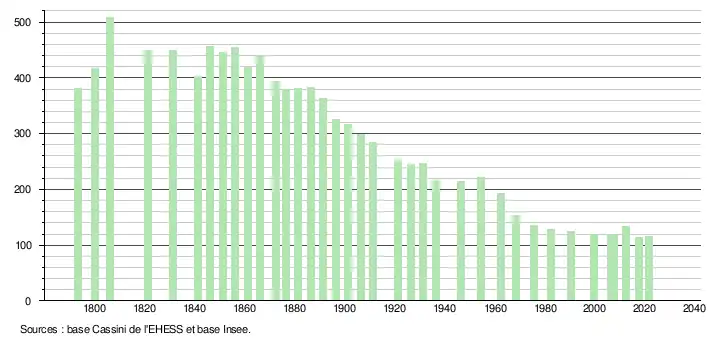 L'évolution du nombre d'habitants est connue à travers les recensements de la population effectués dans la commune depuis 1793. Pour les communes de moins de 10 000 habitants, une enquête de recensement portant sur toute la population est réalisée tous les cinq ans, les populations légales des années intermédiaires étant quant à elles estimées par interpolation ou extrapolation[24]. Pour la commune, le premier recensement exhaustif entrant dans le cadre du nouveau dispositif a été réalisé en 2007[25].