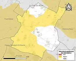 Le retrait-gonflement des sols argileux est susceptible d'engendrer des dommages importants aux bâtiments en cas d’alternance de périodes de sécheresse et de pluie. 64,9 % de la superficie communale est en aléa moyen ou fort (67,4 % au niveau départemental et 48,5 % au niveau national). Sur les 82 bâtiments dénombrés sur la commune en 2019, 62 sont en aléa moyen ou fort, soit 76 %, à comparer aux 81 % au niveau départemental et 54 % au niveau national. Une cartographie de l'exposition du territoire national au retrait gonflement des sols argileux est disponible sur le site du BRGM[17],[Carte 3].