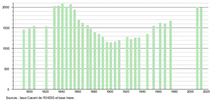 L'évolution du nombre d'habitants est connue à travers les recensements de la population effectués dans la commune depuis 1793. À partir du , les populations légales des communes sont publiées annuellement dans le cadre d'un recensement qui repose désormais sur une collecte d'information annuelle, concernant successivement tous les territoires communaux au cours d'une période de cinq ans. Pour les communes de moins de 10 000 habitants, une enquête de recensement portant sur toute la population est réalisée tous les cinq ans, les populations légales des années intermédiaires étant quant à elles estimées par interpolation ou extrapolation[12]. Pour la commune, le premier recensement exhaustif entrant dans le cadre du nouveau dispositif a été réalisé en [13],[Note 1].