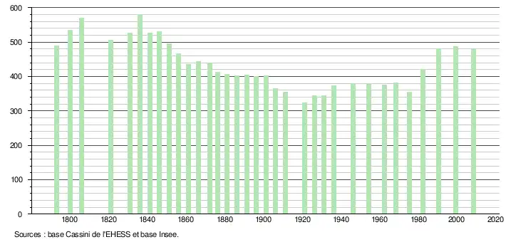 - Dans le tableau des recensements et le graphique, par convention dans Wikipédia, le principe a été retenu, pour les populations légales postérieures à 1999 de n’afficher dans le tableau des recensements et le graphique que les populations correspondant à l'année 2006, première population légale publiée calculée conformément aux concepts définis dans le décret no 2003-485 du 5 juin 2003, et les années correspondant à une enquête exhaustive de recensement pour les communes de moins de 10 000 habitants, ainsi que la dernière population légale publiée par l’Insee.
