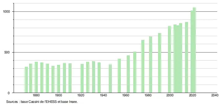 L'évolution du nombre d'habitants est connue à travers les recensements de la population effectués dans la commune depuis 1871. Pour les communes de moins de 10 000 habitants, une enquête de recensement portant sur toute la population est réalisée tous les cinq ans, les populations légales des années intermédiaires étant quant à elles estimées par interpolation ou extrapolation[20]. Pour la commune, le premier recensement exhaustif entrant dans le cadre du nouveau dispositif a été réalisé en 2004[21].