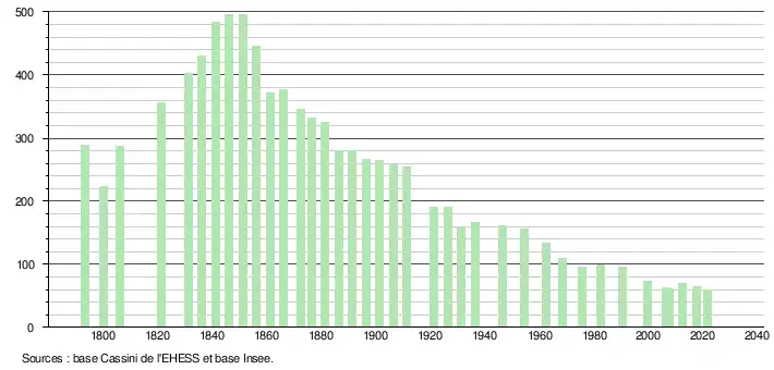 L'évolution du nombre d'habitants est connue à travers les recensements de la population effectués dans la commune depuis 1793. Pour les communes de moins de 10 000 habitants, une enquête de recensement portant sur toute la population est réalisée tous les cinq ans, les populations légales des années intermédiaires étant quant à elles estimées par interpolation ou extrapolation[22]. Pour la commune, le premier recensement exhaustif entrant dans le cadre du nouveau dispositif a été réalisé en 2007[23].