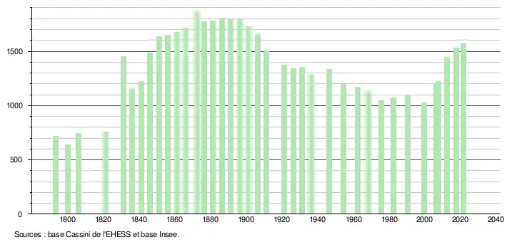 L'évolution du nombre d'habitants est connue à travers les recensements de la population effectués dans la commune depuis 1793. Pour les communes de moins de 10 000 habitants, une enquête de recensement portant sur toute la population est réalisée tous les cinq ans, les populations légales des années intermédiaires étant quant à elles estimées par interpolation ou extrapolation[19]. Pour la commune, le premier recensement exhaustif entrant dans le cadre du nouveau dispositif a été réalisé en 2007[20].