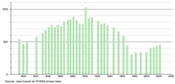 L'évolution du nombre d'habitants est connue à travers les recensements de la population effectués dans la commune depuis 1793. Pour les communes de moins de 10 000 habitants, une enquête de recensement portant sur toute la population est réalisée tous les cinq ans, les populations légales des années intermédiaires étant quant à elles estimées par interpolation ou extrapolation[17]. Pour la commune, le premier recensement exhaustif entrant dans le cadre du nouveau dispositif a été réalisé en 2006[18].
