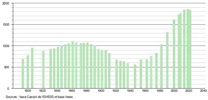 L'évolution du nombre d'habitants est connue à travers les recensements de la population effectués dans la commune depuis 1793. Pour les communes de moins de 10 000 habitants, une enquête de recensement portant sur toute la population est réalisée tous les cinq ans, les populations légales des années intermédiaires étant quant à elles estimées par interpolation ou extrapolation[28]. Pour la commune, le premier recensement exhaustif entrant dans le cadre du nouveau dispositif a été réalisé en 2008[29].