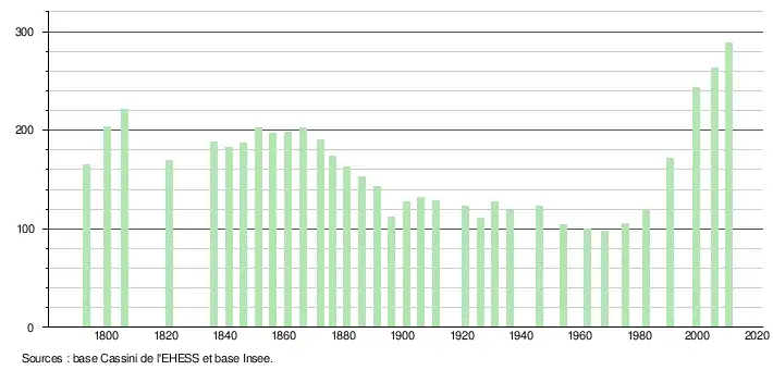 L'évolution du nombre d'habitants est connue à travers les recensements de la population effectués dans la commune depuis 1793. À partir du , les populations légales des communes sont publiées annuellement dans le cadre d'un recensement qui repose désormais sur une collecte d'information annuelle, concernant successivement tous les territoires communaux au cours d'une période de cinq ans. Pour les communes de moins de 10 000 habitants, une enquête de recensement portant sur toute la population est réalisée tous les cinq ans, les populations légales des années intermédiaires étant quant à elles estimées par interpolation ou extrapolation[12]. Pour la commune, le premier recensement exhaustif entrant dans le cadre du nouveau dispositif a été réalisé en 2005[13],[Note 1].