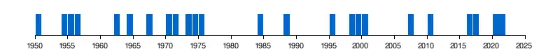 Pour la période débutant en 1950, la Terre a connu de nombreux épisodes de la Niña, le dernier remontant de 2020 à janvier 2023[6].