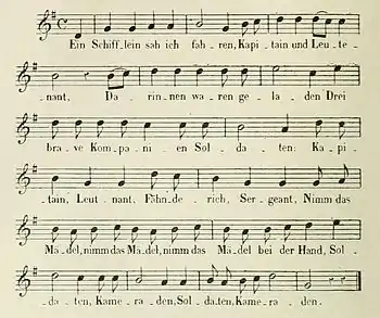 Elle se chante sur l'air d'une marche militaire allemande Ein Schifflein Sah Ich Fahren harmonisé par Auber[1]. Cette chanson allemande est originaire de Westphalie, où elle était encore populaire en 1886[2].