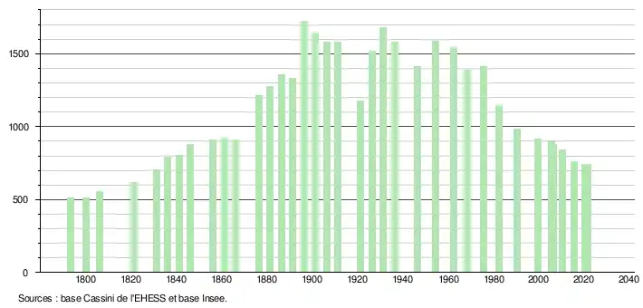 L'évolution du nombre d'habitants est connue à travers les recensements de la population effectués dans la commune depuis 1793. Pour les communes de moins de 10 000 habitants, une enquête de recensement portant sur toute la population est réalisée tous les cinq ans, les populations légales des années intermédiaires étant quant à elles estimées par interpolation ou extrapolation[24]. Pour la commune, le premier recensement exhaustif entrant dans le cadre du nouveau dispositif a été réalisé en 2005[25].