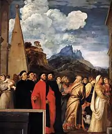 La peinture est adaptée à la forme de la paroi, comme le montre la découpe dans la zone inférieure à la droite, tandis que celle de gauche est postérieure, en raison de l'ouverture d'une seconde porte, avant 1664. Elle est la seule toile monumentale à caractère narratif du Titien.