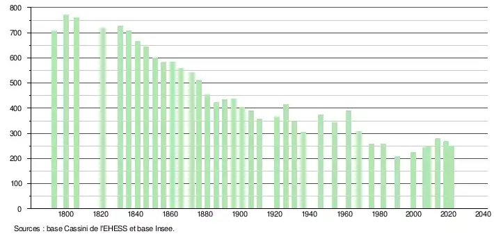 L'évolution du nombre d'habitants est connue à travers les recensements de la population effectués dans la commune depuis 1793. Pour les communes de moins de 10 000 habitants, une enquête de recensement portant sur toute la population est réalisée tous les cinq ans, les populations légales des années intermédiaires étant quant à elles estimées par interpolation ou extrapolation[22]. Pour la commune, le premier recensement exhaustif entrant dans le cadre du nouveau dispositif a été réalisé en 2008[23].