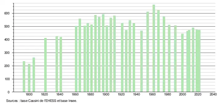 L'évolution du nombre d'habitants est connue à travers les recensements de la population effectués dans la commune depuis 1793. Pour les communes de moins de 10 000 habitants, une enquête de recensement portant sur toute la population est réalisée tous les cinq ans, les populations légales des années intermédiaires étant quant à elles estimées par interpolation ou extrapolation[16]. Pour la commune, le premier recensement exhaustif entrant dans le cadre du nouveau dispositif a été réalisé en 2008[17].