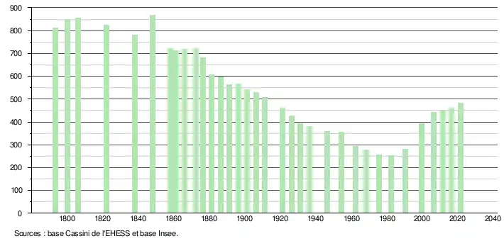 L'évolution du nombre d'habitants est connue à travers les recensements de la population effectués dans la commune depuis 1793. Pour les communes de moins de 10 000 habitants, une enquête de recensement portant sur toute la population est réalisée tous les cinq ans, les populations légales des années intermédiaires étant quant à elles estimées par interpolation ou extrapolation[13]. Pour la commune, le premier recensement exhaustif entrant dans le cadre du nouveau dispositif a été réalisé en 2006[14].