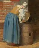 Au fond de l'allée à gauche de la maison, on distingue, également dans un encadrement de porte, une servante en capuchon et fichu blanc sur les épaules, chemise rouge, jupe et tablier bleus. Celle-ci est penchée sur un tonneau, vraisemblablement de récupération des eaux de pluie[1], dans lequel elle plonge les mains. Peut-être lave-t-elle le linge, ou s'apprête-t-elle à laver le sol à grande eau à l'aide du balai devant le tonneau, comme dans certains tableaux de Pieter de Hooch. De l'eau s'écoule en effet dans la rigole qui l'évacue vers la rue, et le canal.