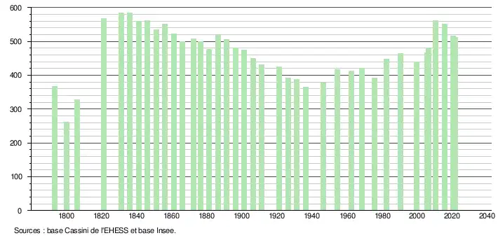 L'évolution du nombre d'habitants est connue à travers les recensements de la population effectués dans la commune depuis 1793. Pour les communes de moins de 10 000 habitants, une enquête de recensement portant sur toute la population est réalisée tous les cinq ans, les populations légales des années intermédiaires étant quant à elles estimées par interpolation ou extrapolation[15]. Pour la commune, le premier recensement exhaustif entrant dans le cadre du nouveau dispositif a été réalisé en 2005[16].