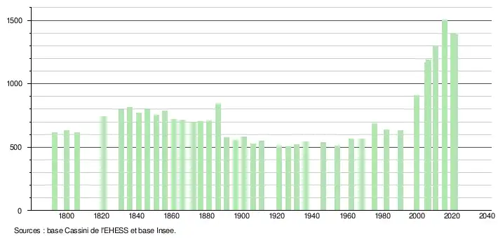 L'évolution du nombre d'habitants est connue à travers les recensements de la population effectués dans la commune depuis 1793. Pour les communes de moins de 10 000 habitants, une enquête de recensement portant sur toute la population est réalisée tous les cinq ans, les populations légales des années intermédiaires étant quant à elles estimées par interpolation ou extrapolation[24]. Pour la commune, le premier recensement exhaustif entrant dans le cadre du nouveau dispositif a été réalisé en 2005[25].