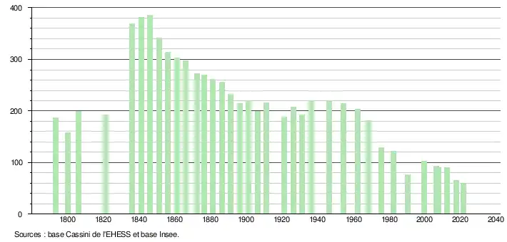 L'évolution du nombre d'habitants est connue à travers les recensements de la population effectués dans la commune depuis 1793. Pour les communes de moins de 10 000 habitants, une enquête de recensement portant sur toute la population est réalisée tous les cinq ans, les populations légales des années intermédiaires étant quant à elles estimées par interpolation ou extrapolation[23]. Pour la commune, le premier recensement exhaustif entrant dans le cadre du nouveau dispositif a été réalisé en 2007[24].