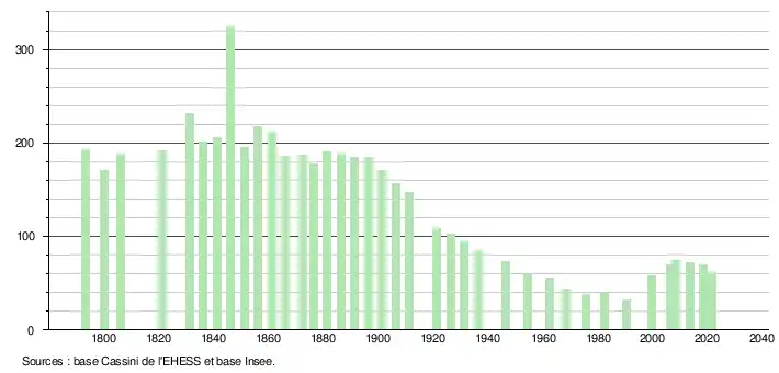 L'évolution du nombre d'habitants est connue à travers les recensements de la population effectués dans la commune depuis 1793. Pour les communes de moins de 10 000 habitants, une enquête de recensement portant sur toute la population est réalisée tous les cinq ans, les populations légales des années intermédiaires étant quant à elles estimées par interpolation ou extrapolation[15]. Pour la commune, le premier recensement exhaustif entrant dans le cadre du nouveau dispositif a été réalisé en 2008[16].