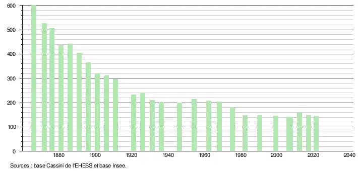L'évolution du nombre d'habitants est connue à travers les recensements de la population effectués dans la commune depuis 1866. Pour les communes de moins de 10 000 habitants, une enquête de recensement portant sur toute la population est réalisée tous les cinq ans, les populations légales des années intermédiaires étant quant à elles estimées par interpolation ou extrapolation[20]. Pour la commune, le premier recensement exhaustif entrant dans le cadre du nouveau dispositif a été réalisé en 2007[21].