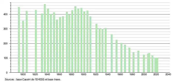 L'évolution du nombre d'habitants est connue à travers les recensements de la population effectués dans la commune depuis 1793. Pour les communes de moins de 10 000 habitants, une enquête de recensement portant sur toute la population est réalisée tous les cinq ans, les populations légales des années intermédiaires étant quant à elles estimées par interpolation ou extrapolation[13]. Pour la commune, le premier recensement exhaustif entrant dans le cadre du nouveau dispositif a été réalisé en 2008[14].
