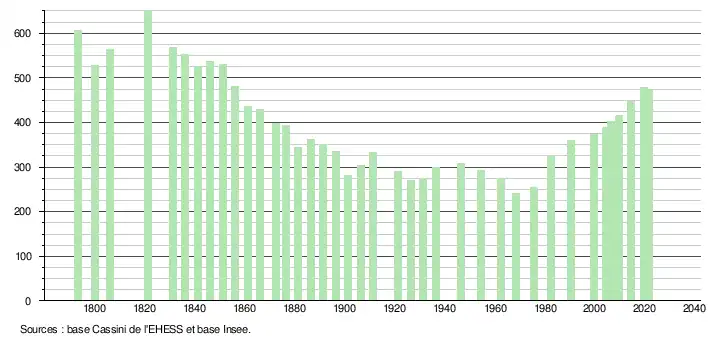 L'évolution du nombre d'habitants est connue à travers les recensements de la population effectués dans la commune depuis 1793. Pour les communes de moins de 10 000 habitants, une enquête de recensement portant sur toute la population est réalisée tous les cinq ans, les populations légales des années intermédiaires étant quant à elles estimées par interpolation ou extrapolation[24]. Pour la commune, le premier recensement exhaustif entrant dans le cadre du nouveau dispositif a été réalisé en 2004[25].