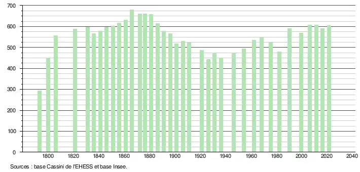 L'évolution du nombre d'habitants est connue à travers les recensements de la population effectués dans la commune depuis 1793. Pour les communes de moins de 10 000 habitants, une enquête de recensement portant sur toute la population est réalisée tous les cinq ans, les populations légales des années intermédiaires étant quant à elles estimées par interpolation ou extrapolation[17]. Pour la commune, le premier recensement exhaustif entrant dans le cadre du nouveau dispositif a été réalisé en 2006[18].